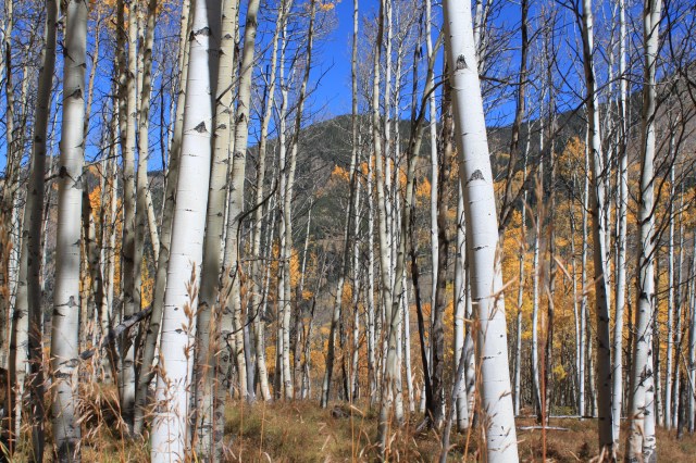 The Aspens grow in large colonies from a single seedling–one single organism and second to the largest—the Great Barrier Reef. They make you question the concept of a tree; only as a young seedling does the plant approximate a typical “tree” with a single trunk and a simple root system. As the seedling (referred to as an ortet) grows, it sends out lateral roots that may extend over 100 feet in many directions. These roots possess an enormous potential for suckering, that is, sending up shoots much like a potato does. Suckers grow into woody stems that superficially resemble individual trees. One seedling eventually expands to as many as 50,000 genetically identical stems arising from one parent root system, and may cover over 100 acres. Suckering is the primary method of aspen propagation. They build communities. The Aspen is nature’s greatest artist at work.