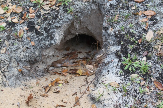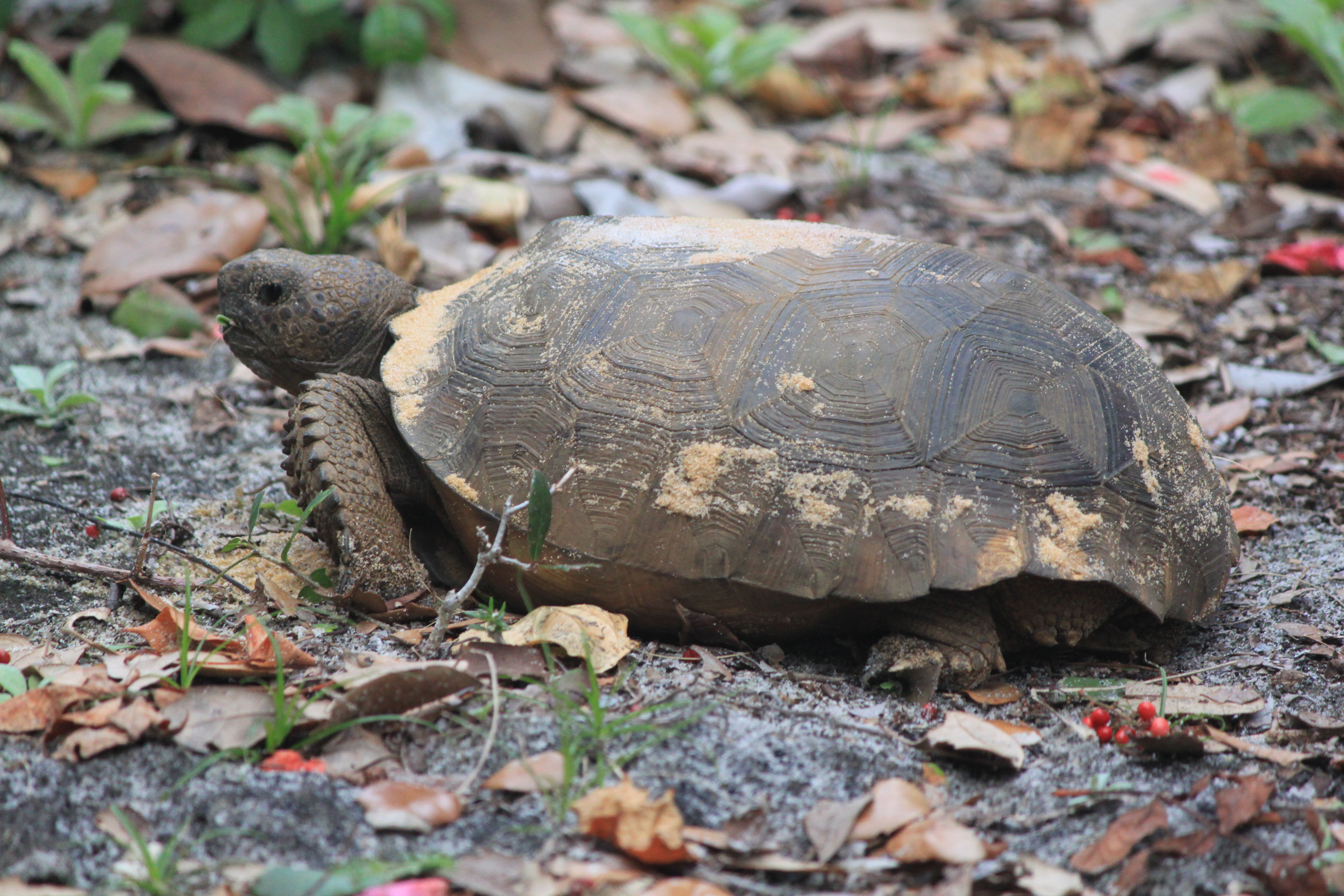 Instead of flippers like a sea turtle, the gopher tortoise has chiseled looking front feet and it burrows. They are important to our ecological landscape because they share their burrows or “digs”. If disturbed, they would leave others species homeless. The Gopher Tortoise is on the Endangered Species List so you are unable to touch them or their homes. They get most of their water from the foodstuffs they eat. The real tongue twister is that the gopher tortoise is a turtle as all tortoises are turtles but not all turtles are tortoises like a gopher tortoise.