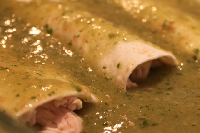These deliciously cheesy enchiladas are stuffed with tender chicken and bathed in a spicy, zesty green tomatillo sauce. Tomatillos, related not to tomatoes but to gooseberries, give the sauce its color and tartness; a jalapeño chile provides just the right amount of heat; and Monterey jack cheese delivers a good dose of richness.