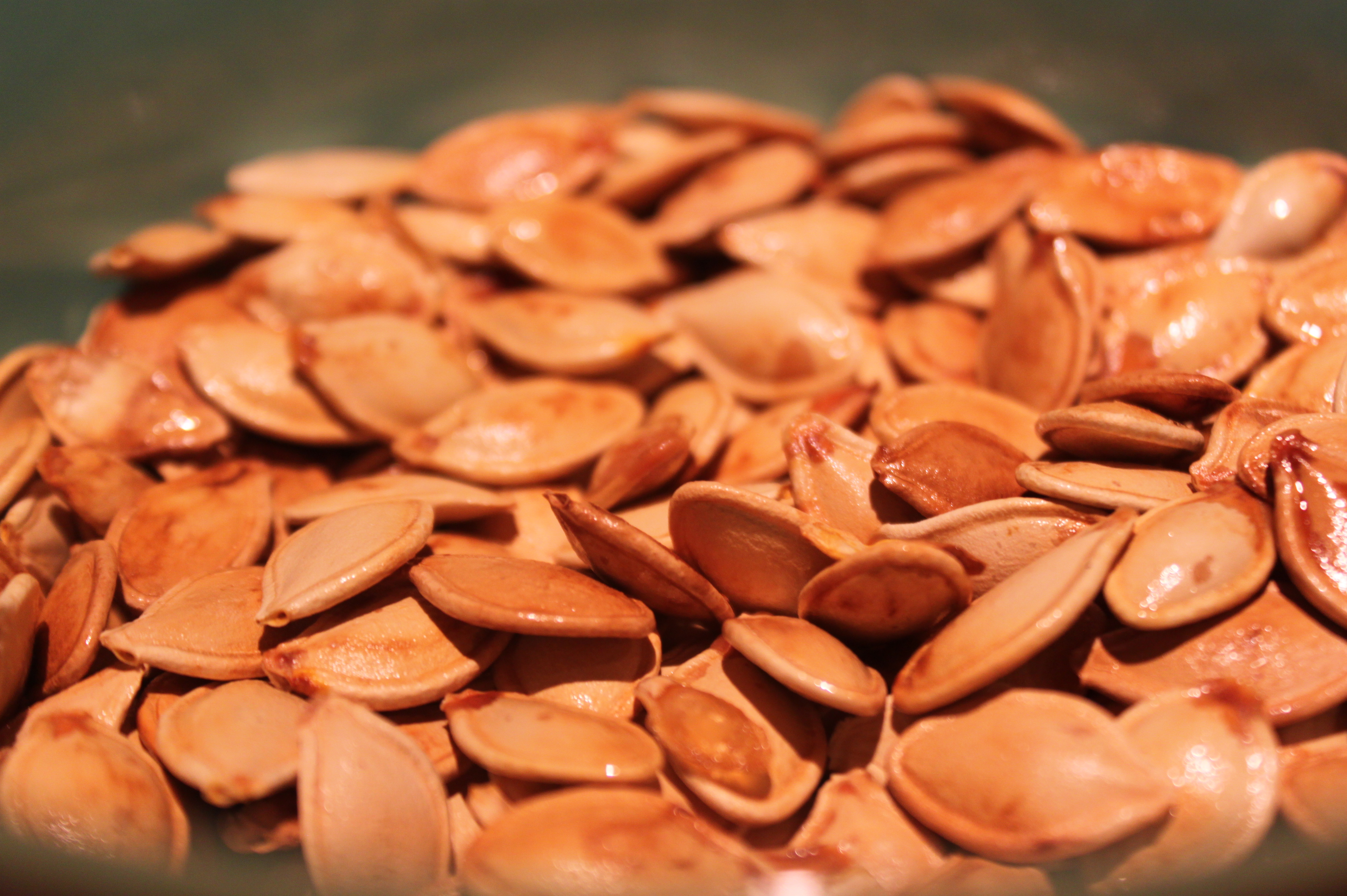 3. Spread about a tablespoon of olive oil over the bottom of a roasting pan. Spread the seeds out over the roasting pan, all in one layer. Bake on the top rack until the seeds begin to brown, 10-20 minutes. When browned to your satisfaction, remove from the oven and let the pan cool on a rack. Let the seeds cool all the way down before eating.